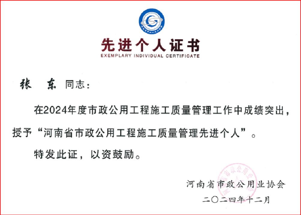 公司总工程师李守坤被授予“2024年度河南省市政公用工程施工企业优秀总工程师”荣誉称号;张东等三位同志荣获“2024年度河南省市政公用工程施工质量管理先进个人”;林坤等两位同志荣获“2024年度河南省市政公用工程施工企业优秀项目经理”;王政凯等三位同志荣获“ 2024年度河南省市政公用工程施工安全管理先进个人”。